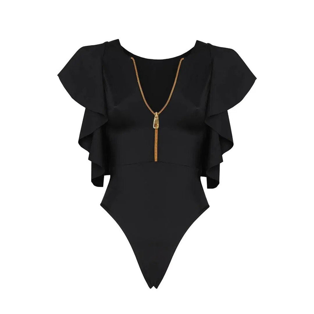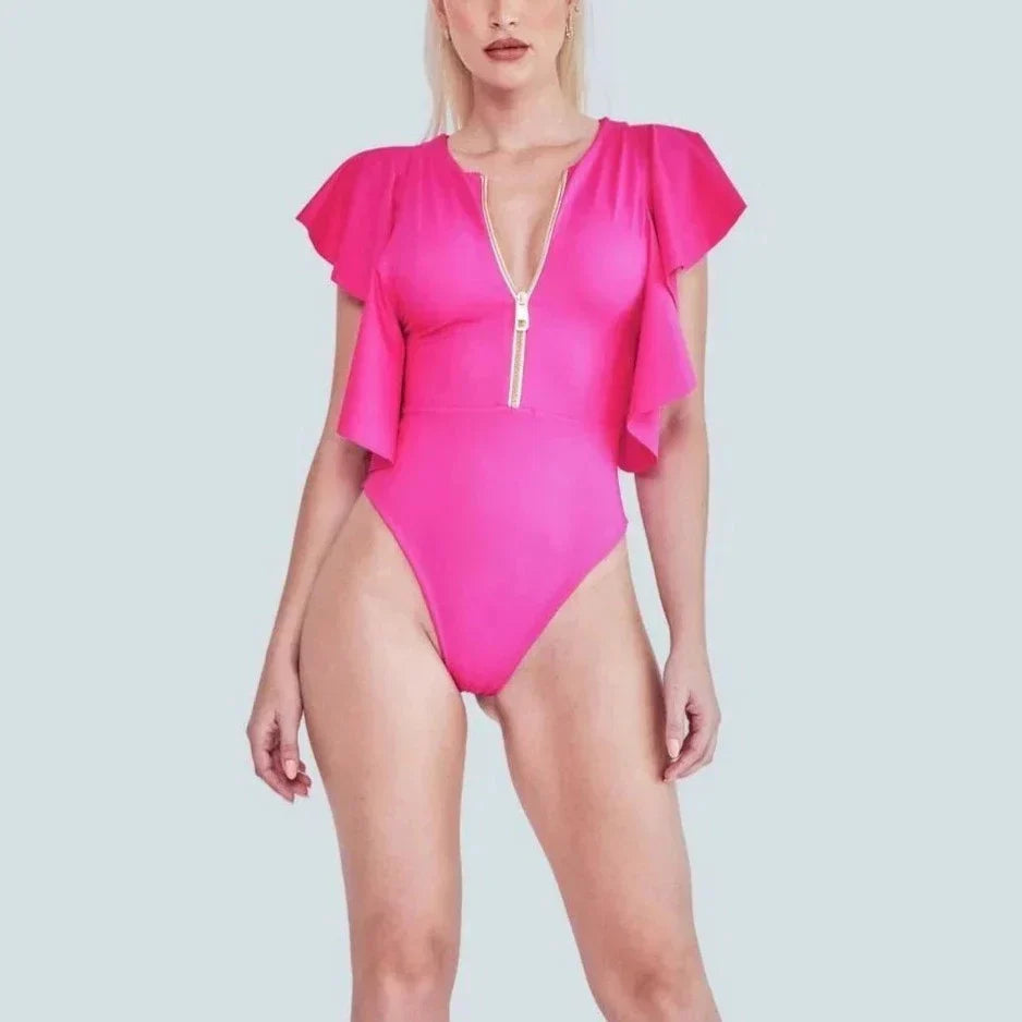 - Detalhes: maiô possui babado nos ombros e fecho frontal em zíper